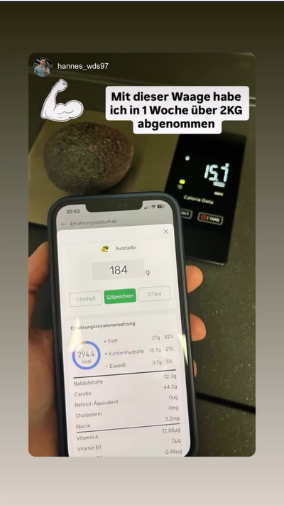 Im Video siehst du, wie einfach du Lebensmittel wiegst, sofort Kalorien und Nährwerte erhältst und alles bequem in der App speicherst. Schnell, präzise und perfekt für deinen Alltag.